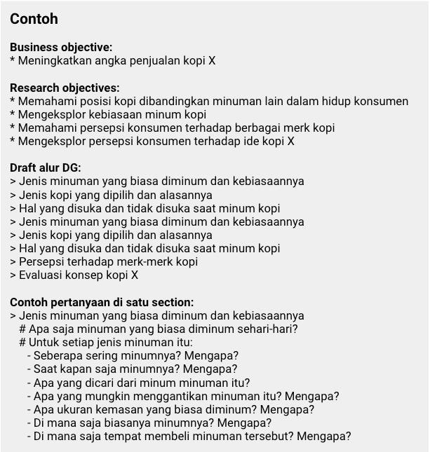 Mungkin kadang researcher akan merasa beberapa pertanyaan tidak perlu ditulis di DG karena sudah pasti ditanyakan. Hanya saja, seperti dibahas di atas, researcher perlu memastikan DG memasukkan pertanyaan dengan cukup detil agar klien/ stakeholder yakin bahwa pertanyaan mereka sudah diakomodasi.